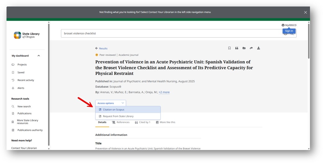 While we chose Scholarly Graph for our “cited by” generator for its in-platform content, I am glad we still have our Scopus CustomLink (called EDS – Scopus), which offers “[arrow] Citation on Scopus” on the Access Options menu when appropriate (see screenshot below). If you don’t already have EDS – Scopus added to your profiles, it might be a nice fallback while Scholarly Graph continues to develop/improve
